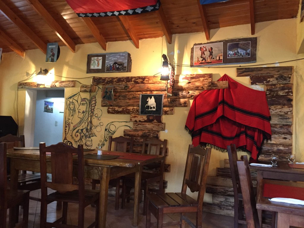 Hungry and thirsty we started the return with everyone laughing at my complaints for how difficult was the decent which is typically easier than the ascent. My toes hurt , my knees hurt, my kidneys, other body parts were in pain. We made it back to town and with it being 4pm in this land, it is sac religious to ask for food at this hour. This is the break time when the town's people take a break from serving tourists. This is the time for themselves to play their music and eat their foods. While I knew and appreciated this ritual, I had an obsession with the thoughts of my prized Lamb dish. We detoured from our return to the hotel and entered a restaurant where I thought we would get the "authentic" experience of Cordero Asado and cure my craving. It was a chance to be among locals and help dissipate my feeling of inadequacy in my business by doing something I truly love: to drink wine and have a nice profound conversation with the locals. We ended up in a place that was filled with Che Guevara's and other's quotes and the Mapuche's culture photos and flags and book titles that have revolutionary tones. This would be a perfect place to cheer me up. I was overjoyed when the owner/attendant agreed to serve us and that they could served the Cordero Asado for which I craved. I chose to stay, against my son's protests. His idea was to just mingle with the mainstream and eat at the restaurant within our hotel. I loved experiencing the Bohemian lifestyle while treated to a few of the local musicians sitting around practicing their music. I cherish the nice, long talk with the restaurant owner. We talked history and learned more about the Mapuche's and Tehuelches , native roots in Patagonia. This interest had been sparked and had become a favorite subject during my earlier conversations with another restauranteur, Mario from the restaurant 'Don Raul' in San Pedro de Atacama (Chile). This latest conversation regarding the Mapuche culture made me remember and appreciate my admiration for their culture. Mario explained how the Mapuche people were the strongest fighters defending themselves against not only the Spanish conquistadores but the mighty Inca attempts to conquer. This is an interesting subject that I plan to continue to research.